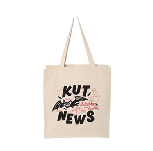 Our latest KUT tote design features the iconic Austin skyline, which wouldn’t be complete without the Mexican free-tailed bat. We worked with local artist and designer Bryan Spear to create this unique tote made just for KUT News. Printed in two colors on a natural canvas, this tote can hold anything from your daily essentials to your favorite books.
